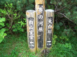 高岡4:50=登山口(7:05~30)=室堂5.9キロ・大白川1キロの地点(8:00~05)=室堂4.9キロ・大白川2キロの地点(8:30~35)=室堂3.9キロ・大白川3キロの地点(9:05~10)=大倉山避難小屋9:40=室堂1.9キロ・大白川5キロの地点=10:00=雪渓休憩2264m(10:25~35)=カンクラ雪渓10:40=賽の河原11:15=室堂(11:3035)=高天原(頂上まで500m.室堂620m)11:50=白山頂上(11:55~12:00)=室堂センター(12:15~13:40)=大倉山避難小屋(15:05~20)=2キロ地点16:00=登山口(16:45~17:00)=高岡19:30