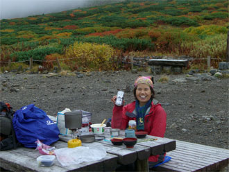 大倉山付近で雨が止み、視界が広がったのを見計らって、そこでも断念する4名のグループに、「もう少し、頑張ったら・・」 と声を掛ける。その先、賽の河原付近まで、始まったばかりの紅葉を楽しむ。真っ赤に染まったナナカマドがあるかと思えば、全く色付いていないナナカマドもあり、一週間から10日先が、見頃のように思った。室堂に着いて、空かしたお腹のために、霧雨の中で、テーブルに着き、まずは食事!
