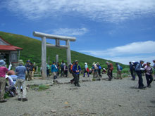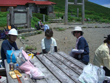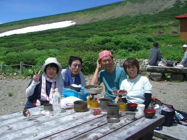 「お腹が空いた。」 と山頂に向かう前に、室堂で店を広げる事になる。「冷たい0.00%ビールを持ってきたか・・・」 と山ノ神に尋ねると、「持って来なかった。」 と言う。がっかりすると、「今日は絹子さんが運転してくれるから、飲める日です。」 と・・・「あっ~、そうか」 解凍されてちょうど飲み頃のビールは、天にも昇る気持ちとさせてくれた。