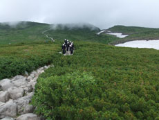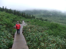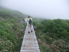 滑らないように、気を付けて木道を行く。 |