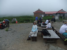 | 山頂(御前峰)に、行く行かないとなった が、結局、室堂で、1時間余ゆっくり休憩。 そして、南竜ヶ馬場に行く事になる。 |