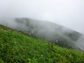 | ガスが掛る山並みとクガイソウ。 |