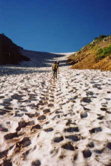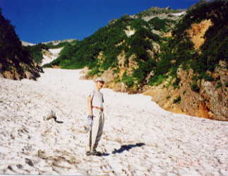 デジカメを持っていた「横浜のジョナサン君」の出会いの場所にもなった。純朴そうな顔に白い日焼け止めを塗った、何故か愛想のある彼とほんの暫くの間だが行動を共にすることになった。パソコン、ホームページの話をしながら、左の狭まった雪渓をなおも登り続ける。