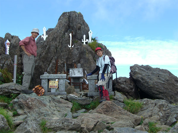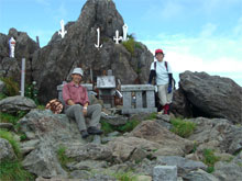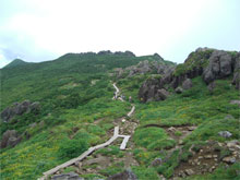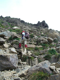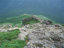 | 早池峰山頂で記念写真。 | 降り始めは、穏やかな木道だったが・・ | 次第に岩が現れるが、コメガモリ沢より歩き易い。 |