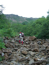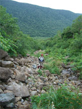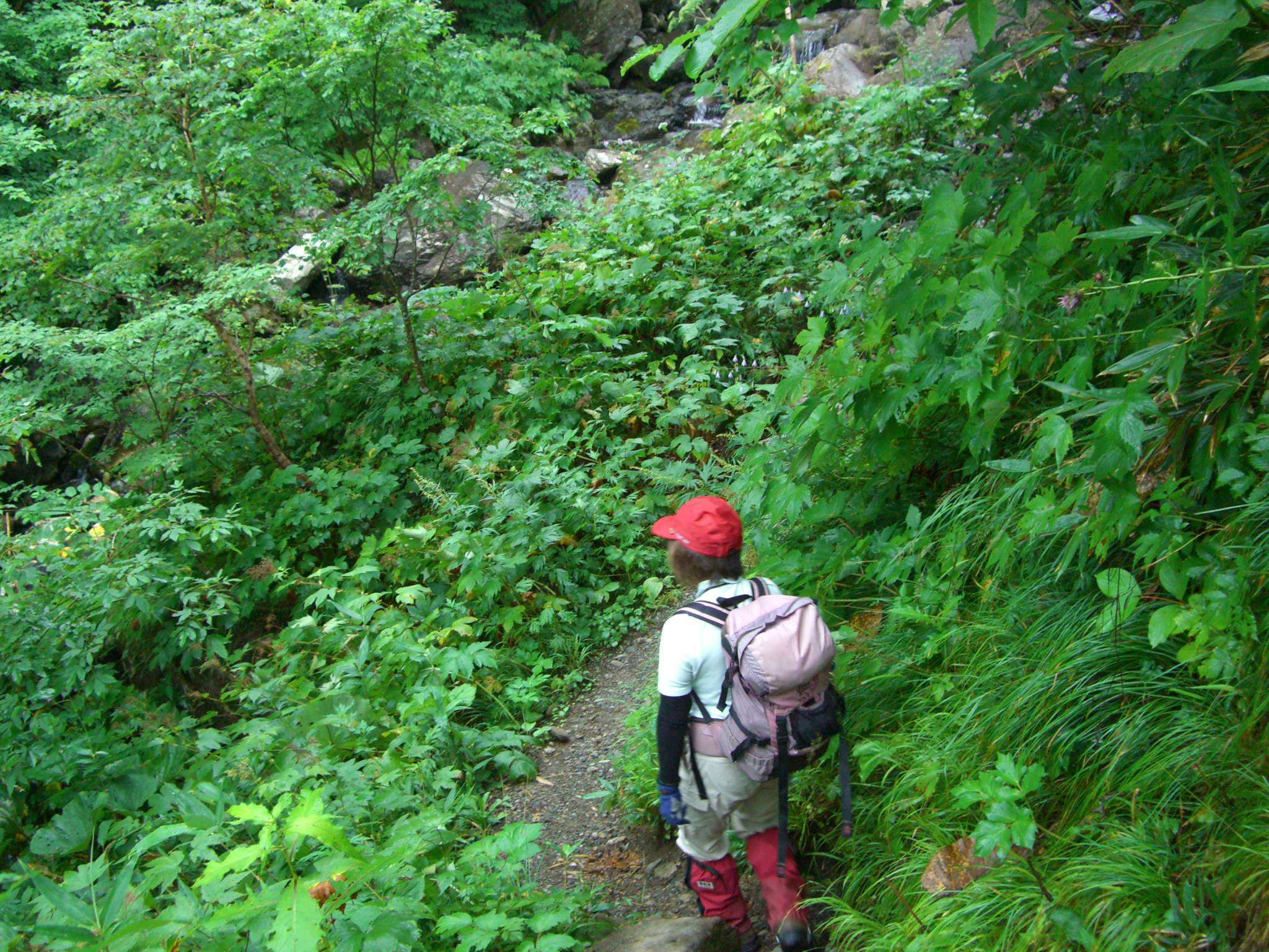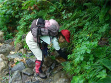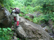 | 始めは右岸を行く。 | 滑りそうな一枚岩を乗り越える。 | 水場では、必ず一口の「山ノ神」。 |