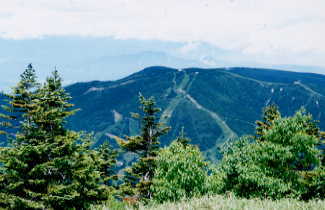私達が山頂に着いた頃に、ノッキリあたりから凄い勢いで登って来たアメリカ人の青年一人を除いて、今日も我々だけの山頂からの展望は、南にアンテナのある同じ志賀の横手山、その右に端正な笠ヶ岳。横手山の左は、火山跡の白い山が白根山でその奧が浅間山。西方面は雲が厚くかすかに北アルプスの山々の頭だけが見えた。その手前には、寺子屋山から東館山への稜線の道が浮かぶようにスッキリと見えた。東側の真ん前には、焼額山がスキー場としての姿を鮮やかに見せていた。