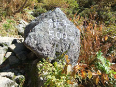 | 熊のおどり場 | 他の登山者と談笑しながら・・ | 鏡平まで500mのペイント。 |
