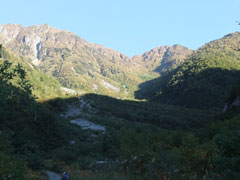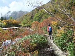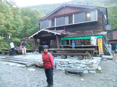 | 蒲田川に架かる仮橋を渡る。 | 笠ヶ岳(笠新道)の登山口を横目に | ワサビ平小屋は休憩ポイント。 |