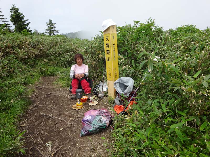 3度目は、天狗原山に荷を置いて迎えに行ったら、「1時間も放っておいて・・」 などと暴言を吐かれた。こちらとて頑張っているのに頭に来る。再び天狗原山で腰を降ろしたのは、午後0時半を回っていた。カップ麺を食した。あれだけ汗を掻いたのだから、少しでも塩分を取っておかないと、また酷い目に合うからである。
