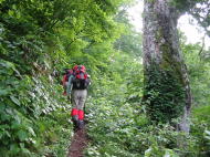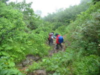 溝のような登山道を行く |
