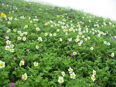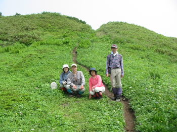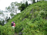蒸し暑く、虫に悩まされながら崩壊地から1時間弱で風衝草原に出る。ここからは、ずーっとお花と向き合って歩き続けるのである。