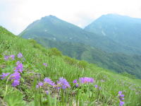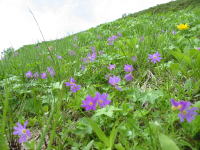天狗原山から下りになるが、その斜面一帯に、ハクサンコザクラが群落を作っていて、「ワ~ッ、ワ~ッ」と誰ともなく声が出る。天狗原山の石仏のある斜面では、チングルマが主流を努めていたが、今は完全に薄紫のハクサンコザクラが主役である。