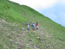 焼山も近付いて来るが、金山への緑の絨毯のような山並みが美しい。そして、ずーっとお花畑が続くのである。今年は雪量が少なかったのか、それとも雪解けが早かったのか、金山も例年になく残雪が少なかった。