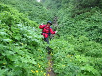 小沢の中を歩く。残雪のカケラがあった。やがて、ぬかるみとなり、そして、崩壊地の下に出る。ここは、キヌガサソウの群落のある所でもある。