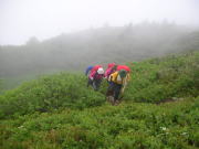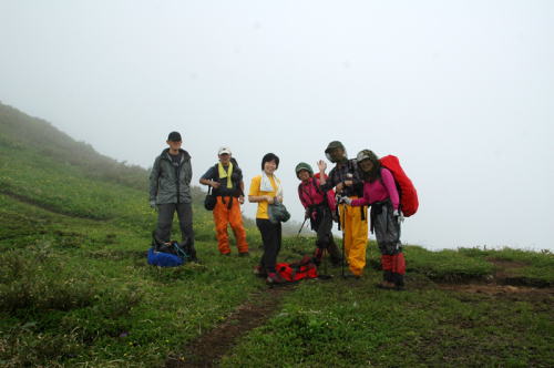 総勢7名が頭から防虫ネットを纏うという、正しくネット軍団!(ネットの繋がりなどの事もあり、可笑しな軍団の総称としては面白かった。)そして、登り始めから雨の懸念で纏った雨具は、ぬかるみに泥だらけ、そして、風もなく虫に悩まされ続ける。
