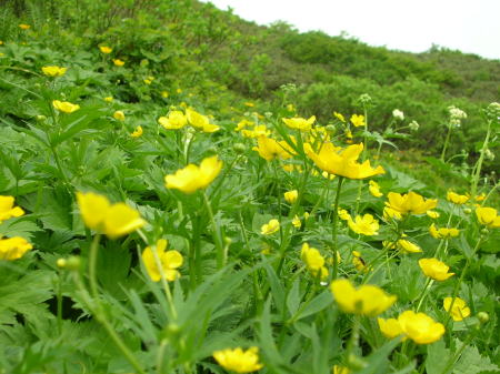 しかし、それを払拭するかのようなお花畑に今年も歓声を上げた。「ここにも、あそこにも、こっちにも、こっちにも」、例年よりも残雪が多く、まだこれからの所もあるが、シナノキンバイとハクサンコザクラ、キンポウゲなどが目立った。