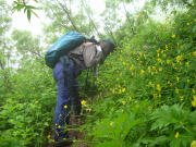 7/25 好山病友の会の山行は、過去一度だけ、車を乗合わせて事があったが、原則登山口または、その周辺の分かりやすい所の集合で、車上でワイワイガヤガヤという事は少ない。今回はeiko女史の計らいがあり、素晴らしい車で、魚津から金山登山口まで便乗する事になった。可愛い妻君を気遣って先行していた長勢君に、山中で追いついた頃には、虫・虫・虫・・・の話ばかり。
