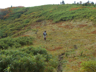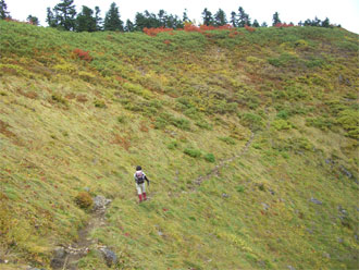 | 天狗原山から、夏花咲くお花畑を降りる。 |