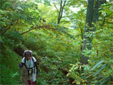 谷間の滑りやすい登山道 |