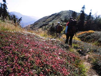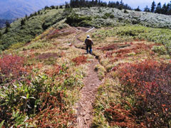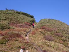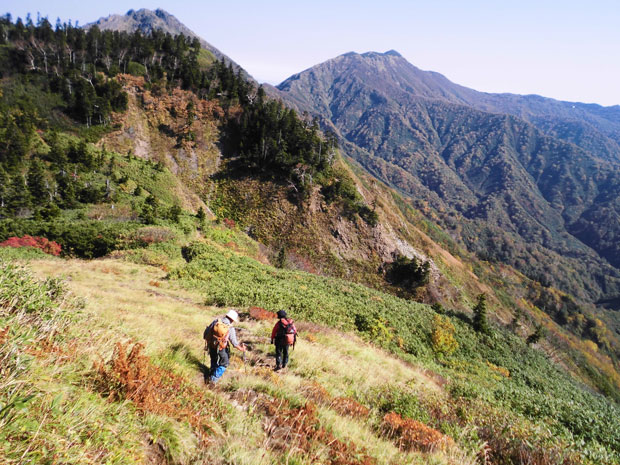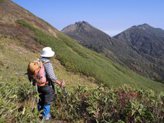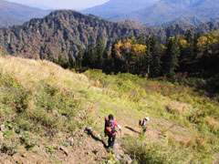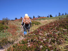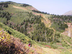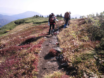 高岡3:10=魚津IC4:00=糸魚川IC=小谷道の駅=登山口(5:45~55)=水場(6:45~50)=崩壊地8:25=天狗原山(9:30~10:00)=金山頂上(10:45~12:30)=天狗原山(13:00~15)=崩壊地(14:05~10)=水場(14:50~55)=登山口(15:35~45)=露天風呂=糸魚川IC=魚津IC=高岡