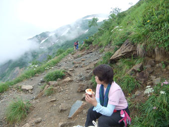 「山ノ神」は結構頑張っていたが、丸山ケルンの手前の雪渓付近から、急激に元気を失ってしまった。やはり、「4時間足」なのかもしれない。黒菱平から唐松山荘まで、6時間余かかってしまったが、「ゆっくり歩き、涼が目的」 であったから、何の問題もなかった。
