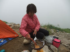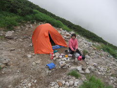 一番下だから、静かそのもの。雪渓の水を求める一組だけが、テント前を横切っただけである。視界はないが、お酒は充分にある。 (途中、丸山ケルンで足の止まった「山ノ神」を勇気付けるために、一本のビールを分けて飲んでは来たが・・)