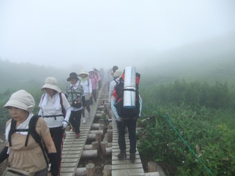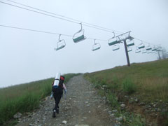 8/6 いつもの通り、ちょっと出遅れた事もあり、黒菱平のリフトは動いていた。私は23キロ、「山ノ神」は13キロを担いで、そのリフトに目もくれず、予定通り歩く事になった。黒菱第3リフトと、グラードクワットの分を歩くのは、我が家の定番であるが、テン泊用の荷を担いででは初めてであった。