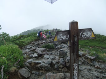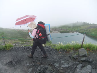 八方池手前で突然の雨となり、目の前を歩くハイカー達は騒然となった。「山ノ神」も、雨具を着込んだが、私は、風がなかったので傘だけで凌いだ。「その内、雨は上がるだろうし、気温が低くないから、ちゃんと乾いてくれるだろう。」 というのが、ずぼらな私の考えである。