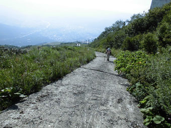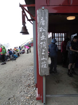 | 山頂から唐松山荘を望む。 | 山頂から降りて、唐松山荘前を行く。 |