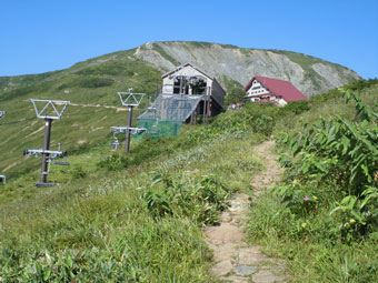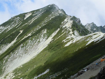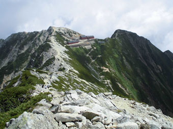 | 唐松山荘は賑わっていた。 | 唐松山荘から山頂へ稜線。 |