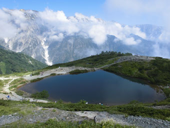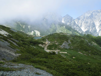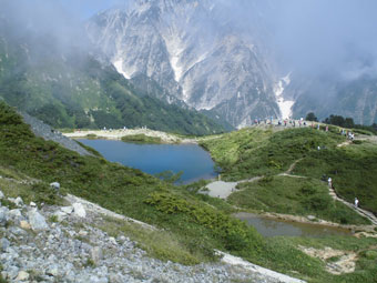 | 不帰ノ嶮にガスが掛かってきた。 | 八方池の周りには大勢の登山者がいた。 |