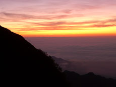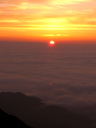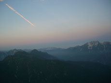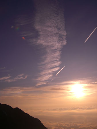 | 空が赤くなり始めたのは、a.m.4:40から | 剱岳も見え始める。飛行機雲も・・ | 「ねぎちゃん」 |