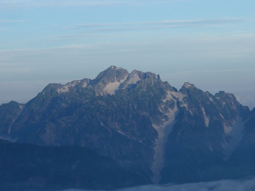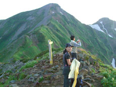 | 剱岳がだんだんと良くなって来る。 | 布引山から鹿島槍ヶ岳山頂を目指す。 |