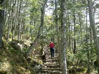 | シラビソ林の中に作られた丸太階段を行く |
