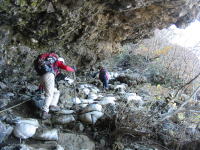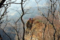 草木が目隠しとなり、さほど恐怖感はない。梯子やロープに繋がりながら、せり出した岩の下を潜り抜けると、今度は急登が待っている。雨の後などは滑らないように気を付けなければなるまい。