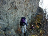 第二の水場から、大きな岩の間を抜けると大岩壁の前に出る。その岩壁に圧倒されそうになるが、すそを見るとバンド状に登山道が延びている。