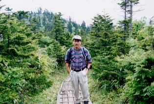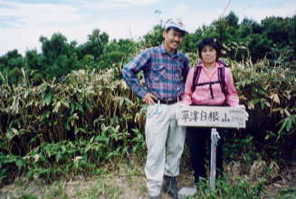 しかし、我々は納得しなかった。最高点から万座方面へ少し行くと、「立ち入り禁止」の看板とロープが張ってあった。硫化水素ガスが発生するので、危険と言う事らしいが、それも風向きによってであろうと思い、よく踏まれた道を頂上に向かって歩んだ。僅か15分程の道程だが、やはりガスの臭いが、時にはきつく感じられ、展望も良くない頂上で、記念写真を撮ってすぐ引き返した。頂上にある看板には、2171㍍と記入されていた。今一度最高点に戻り簡単な食事をした。雨の合間の展望に、浅間山を望むのは、欲張りだったかも知れないが、最後まで、その薄っすらとした輪郭でさえ、見せてくれなかったのは寂しかった。僅かに妙義、榛名の山々が、ほんのチョッピリ頭の部分だけが見えた。でも、反対側の笠ヶ岳(2076㍍)と横手山(2304㍍)は、今回あわよくば、一緒に登る山だっただけに頗る立派に見えた。