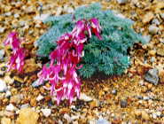 ゴンドラ駅横の「頂上まで2.4キロ」の道標を見ながら、本白根ゲレンデ側のルートを選んだ。短いツガ林の整備された道を行くと、まもなく火山地帯特有の枝葉のない木々が現れる。そして、突然「カラ釜」と言われるところに出ると、釜の反対側の、今にも崩れそうな砂礫の斜面に、植え付けられコマクサが、可憐な表情を見せていた。