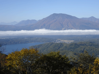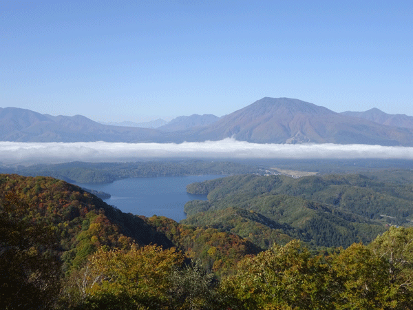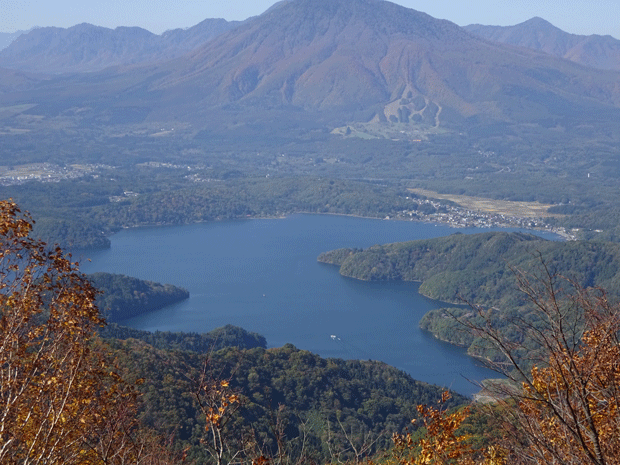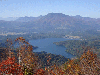 展望台から眺める野尻湖・黒姫山・飯縄山。
