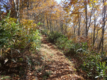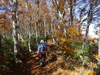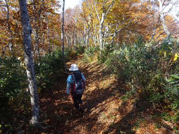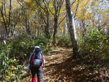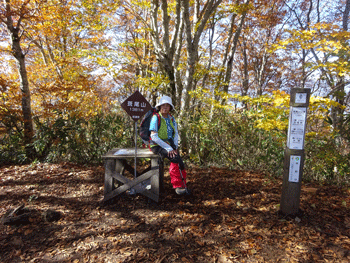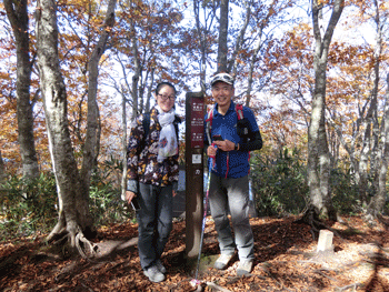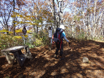斑尾山頂まで、あと500mの所(斑尾高原への分岐)まで、ご一緒してもらいました。その間、短い時間でしたが、たくさん喋りました。本当に好感のもてる女性でした。(家に帰って、PCの前に座った頃に彼女からメールが届きました。) 斑尾山頂上は標識があるだけで、展望もなく、その先に10分ほど歩くと大明神岳があり、展望が良いとの情報を得ていたので、時間のない事は分かっていたのですが行ってきました。