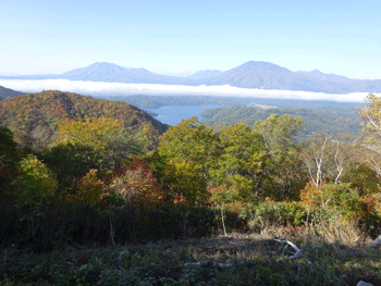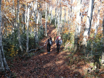 野尻湖と周りの山々とのコントラストが素晴らしく、長居をしたかったのですが、コーヒーも頂かずに戻らなければなりませんでした。そこまで掛かった時間が2時間半だったので、果たして、お昼頃までホテルの駐車場まで戻れるのかと心配でした。下山路は、当初からの予定通り、万坂峠目指しましたが、「山ノ神」は、ずっと我慢をしていたようです。(水休憩以外なかったのですから・・) でも、予定より10分程遅れた程度で車に戻る事が出来ました。