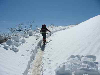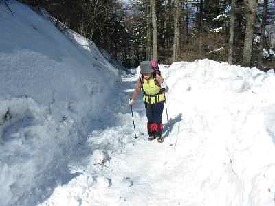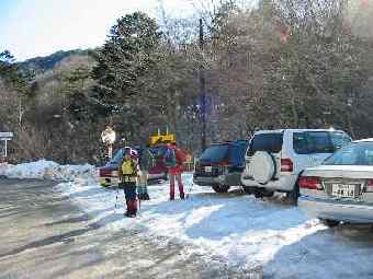予想した雪量よりも多く、登山口で準備していた時に出会った方が、登山道の方が山らしいと言っておられたが、どの事を言われていたのかわからないくらいであった。もっとも、トレースがない所では、カンジキがなくてはとても歩けない状態であった。この林道らしき道も、カーブする所々に、ナンバーのない古びたジープがおり、もしかしたら、除雪車代わりに使われているのではないかと思ってしまった。4輪共にチェーンが巻かれており、ワダチを考えると動いている様であった。雪がなくても我々の車ではとても登り切れないほどの急坂である。