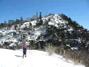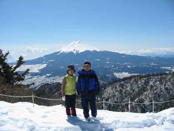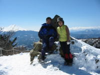 よく踏まれたトレースは、四季楽園の前を通るが、ぬいぐるみのような大きな犬が横たわっていた。その横にあるベンチには、休憩料100円とある。首都圏に近いと、こうなるのかと思い我故郷北アルプスの良さを今更に誇りたくなる。休んでいる富士見荘の前を通って、アンテナを越せば石碑が建つ三ツ峠山頂上である。三ツ峠山荘やその下の肩から富士山を望むよりは、ちょっと樹木が邪魔するが絶景には変わりはない。