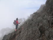 南峰から北峰に進む時、多くの登山者と擦れ違ったが、やはり日曜日の百名山だと思った。座り心地の良くない岩の上で昼食をとりながら、群馬や富山のパーティーなどと、燕新道の落橋の事で行けるか行けないかの協議となった。「最終的に無理する事はない。」の結論に達し、同じルートを戻る事になった。