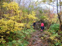 その佐渡・室谷氏と下りを最後までご一緒する事になり、昨年2月上旬の深雪の来拝山の想い出や、彼等の得意な「ヤブ山」の話を聞きながら楽しく降りた。また、名残の紅葉に立ち止まり、同じようにカメラのシャッター切ったりしていた。登りの時に覗いた「黄金の湯」に一緒に浸かったりもして名残惜しく別れた。