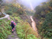 尚も行くと、赤倉温泉源泉小屋になる。燕登山道を歩いているのだが、この湯は燕温泉ではなく、赤倉温泉に行くのであろうか? やがて、光明滝と称名滝が見えて来る。登山道の先は、かなり切り立ているのであるが、そう不安感はない。手前の光明滝上から、本格的な登山道となるのであるが、その流れに手を入れてみると、ちょっと温かった(ぬるかった)。