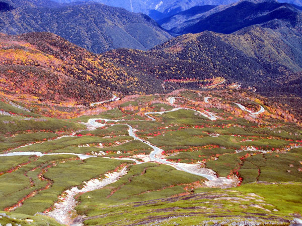 でも、「紅葉は良かった。」 下山時は、稜線をずっと歩いた。す~っと、抜けていくガスの合間の日差しを受けながら、真下に引き詰められたような錦繍の絨毯を眺めながら、短い時間を楽しませてもらった。予定より一つ先のバスの乗り、帰りは、平湯・神岡から41号線で戻った。