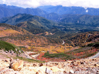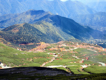 | 山頂付近から素晴らしい紅葉を眺める。 |