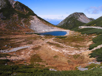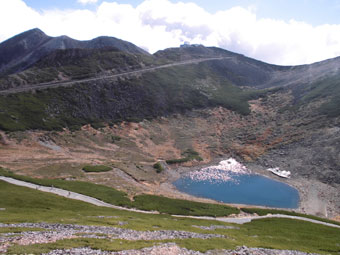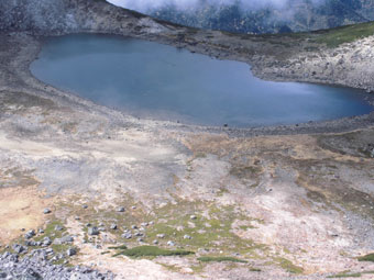 | 富士見岳から不消ヶ池を見下ろす。 |