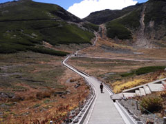 2,700mの畳平までバスが乗り入れ、肩の小屋まで林道のようなものであるから、容易に登れる山となっている。やっとかっとの歩きのお年寄りや、おんぶされた赤ちゃんなど多様であった。